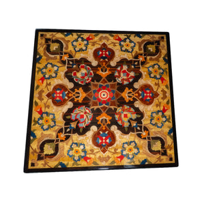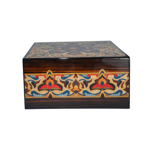 Humidor tipo gabinete artesanal de alta capacidad, elaborado completamente a mano mediante técnica de marquetería, combinando diversas maderas nobles para crear composiciones geométricas y vetas contrastadas de alto valor estético.