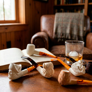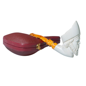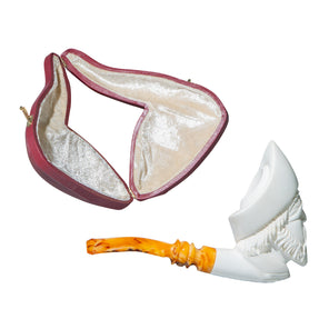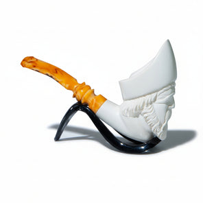 Pipa espuma de mar, modelo cara de pirata, linea recta, boquilla en plastico PVC Descripción del material: Pipa elaborada en espuma de mar (sepiolita natural), mineral magnesiaco poroso de origen natural, extraído principalmente en lran, España, Grecia, Maruecco yTurquia mediante actividad minera subterránea artesanal. Características: Materia! ligero, altamente poroso y resistente al calar, can elevada capacidad de absorción de humedad y temperatura. Color natural blanco marfil. Uso: Artículo destinada a su utilización como pipa para fumar. Con e! uso desarrolla una pátina cromática natural progresiva (tonos miel/ámbar) debido a la absorción de aceites y calar, característica propia del material. Conservación y mantenimiento: Conservar en ambiente seco. Evitar golpes o caídas. No utilizar detergentes ni productos químicos agresivos. Limpieza únicamente en seco. No exponer a luz directa solar ni a fuentes de luz artificial intensa. Manipular con manos limpias para preservar la evolución natural de la pátina.